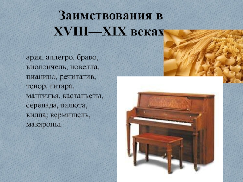 гитара, мантилья, кастаньеты, серенада, валюта, вилла; вермишель, макароны.