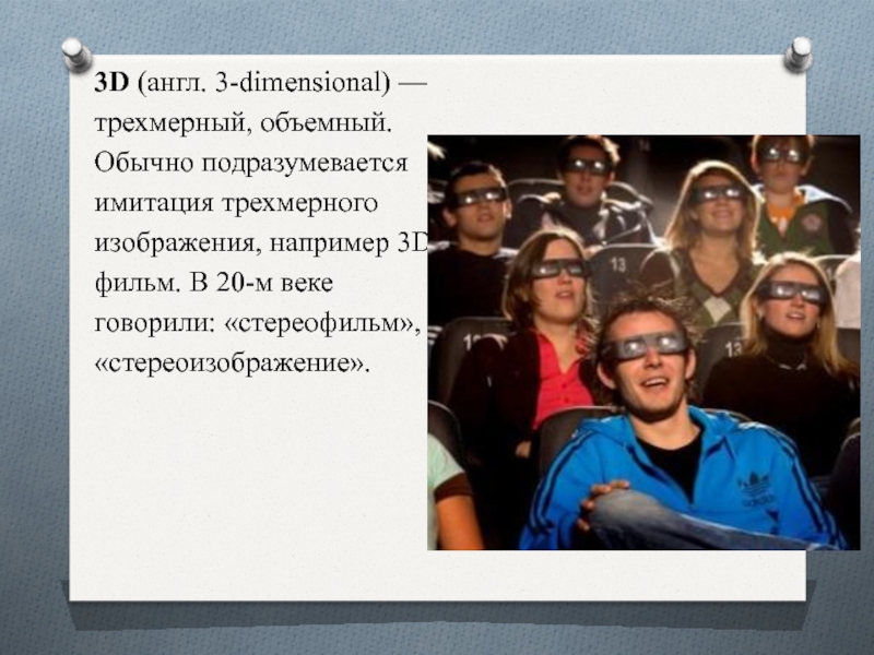 Слайд 213D (англ. 3-dimensional) — трехмерный, объемный. Обычно подразумевается имитация трехмерного изображения,