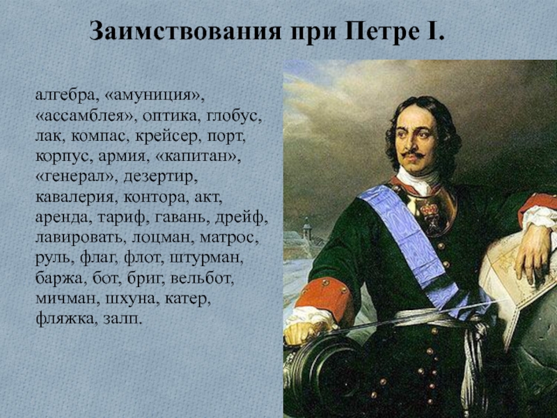 Слайд 8алгебра, «амуниция», «ассамблея», оптика, глобус, лак, компас, крейсер, порт, корпус, армия,