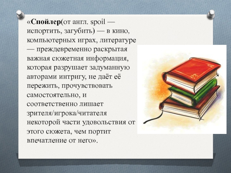 Слайд 20«Спойлер(от англ. spoil — испортить, загубить) — в кино, компьютерных играх,