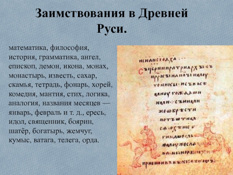 монах, монастырь, известь, сахар, скамья, тетрадь, фонарь, хорей, комедия, мантия, стих, логика, аналогия, названия месяцев — январь, февраль и т. д., ересь, идол, священник, боярин, шатёр, богатырь, жемчуг, кумыс, ватага, телега, орда.