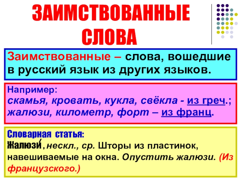 Например: скамья, кровать, кукла, свёкла - из греч.; жалюзи, километр, форт – из франц.