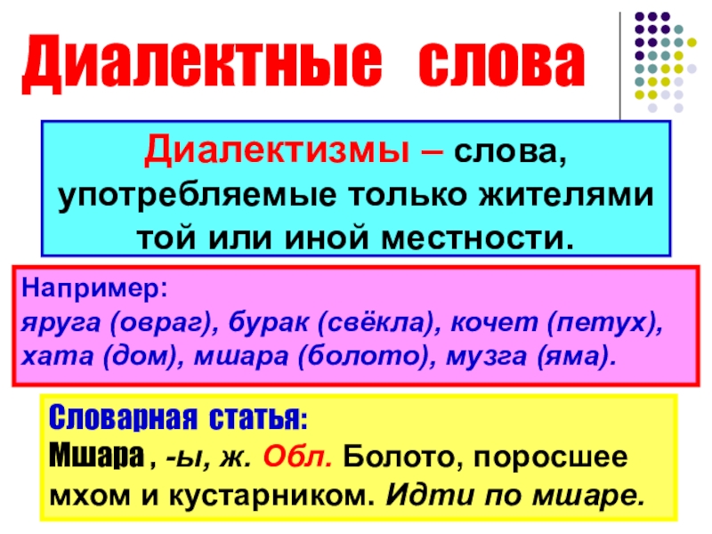 Например: яруга (овраг), бурак (свёкла), кочет (петух), хата (дом), мшара (болото), музга (яма).