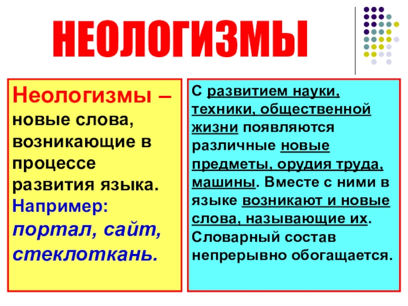 Неологизмы – новые слова, возникающие в процессе развития языка. Например: портал, сайт, стеклоткань.
