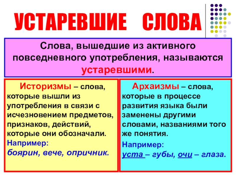 Историзмы – слова, которые вышли из употребления в связи с исчезновением предметов, признаков, действий, которые они обозначали. Например: боярин, вече, опричник.