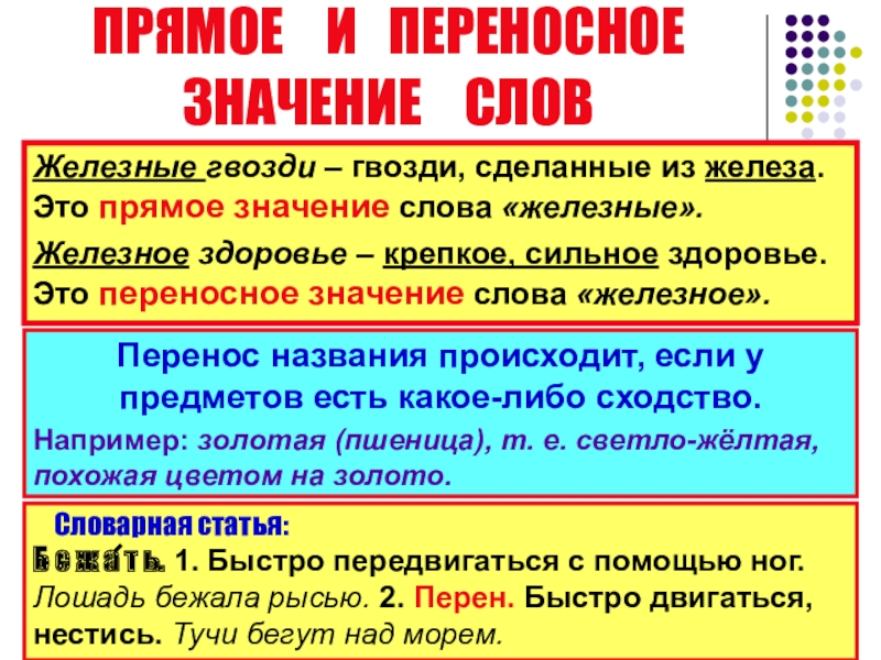 Словарная статья: Б е ж а т ь. 1. Быстро передвигаться с помощью ног. Лошадь бежала рысью. 2. Перен. Быстро двигаться, нестись. Тучи бегут над морем.