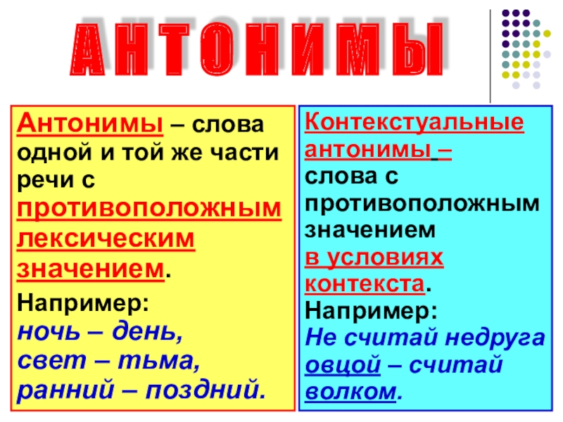 Контекстуальные антонимы – слова с противоположным значением в условиях контекста. Например: Не считай недруга овцой – считай волком.