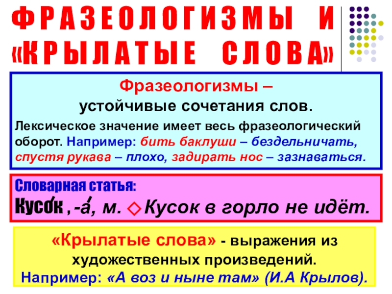 «Крылатые слова» - выражения из художественных произведений. Например: «А воз и ныне там» (И.А Крылов).