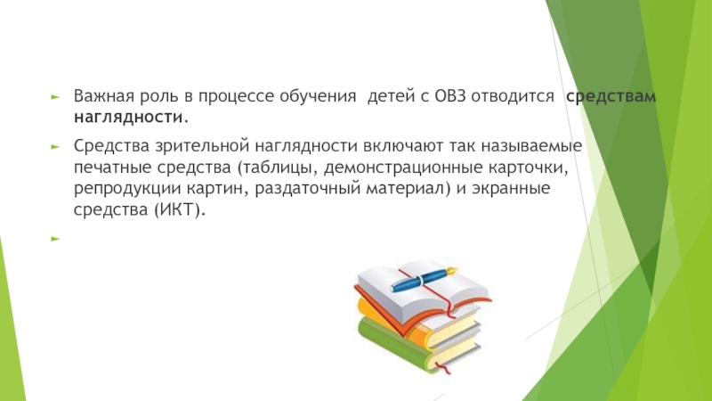 Слайд 10Важная роль в процессе обучения детей с ОВЗ отводится средствам наглядности.