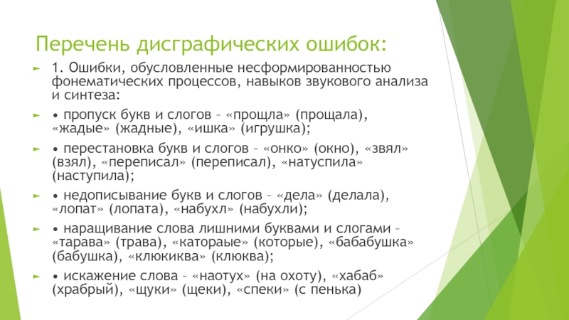 Слайд 4Перечень дисграфических ошибок: