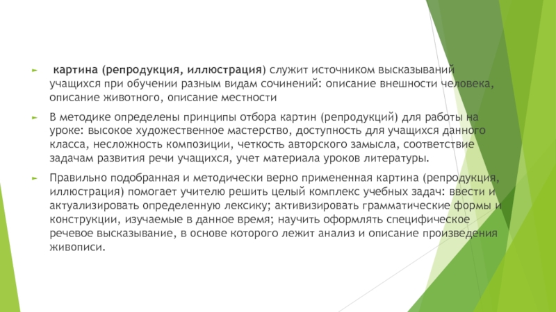 В методике определены принципы отбора картин (репродукций) для работы на уроке: высокое художественное мастерство, доступность для учащихся данного класса, несложность композиции, четкость авторского замысла, соответствие задачам развития речи учащихся, учет материала уроков литературы.