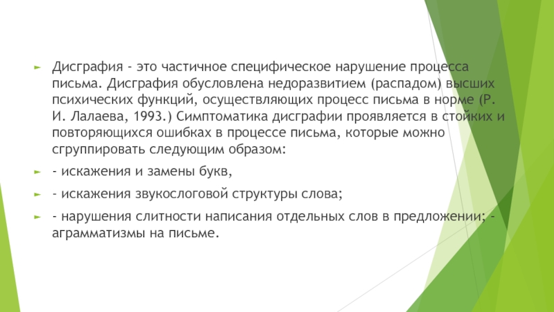 Слайд 2Дисграфия - это частичное специфическое нарушение процесса письма. Дисграфия обусловлена недоразвитием