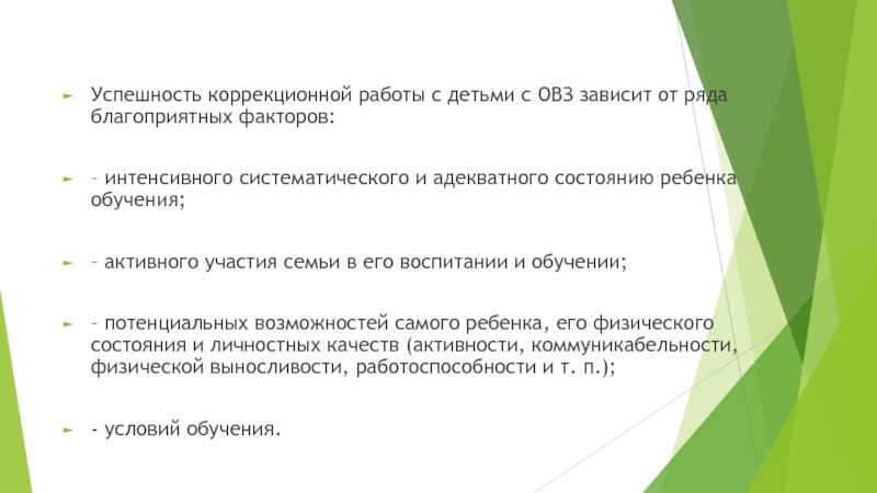 Слайд 19Успешность коррекционной работы с детьми с ОВЗ зависит от ряда благоприятных