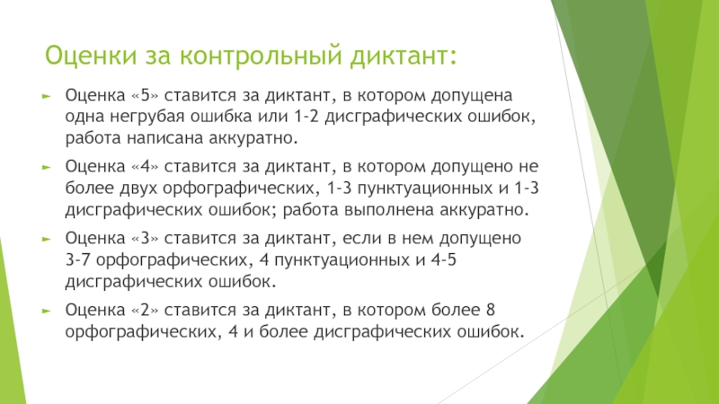 Оценка «5» ставится за диктант, в котором допущена