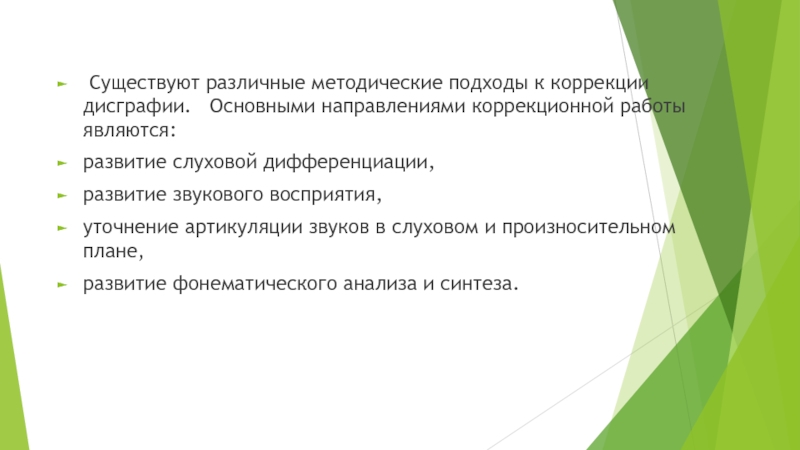 Слайд 7 Существуют различные методические подходы к коррекции дисграфии. Основными направлениями