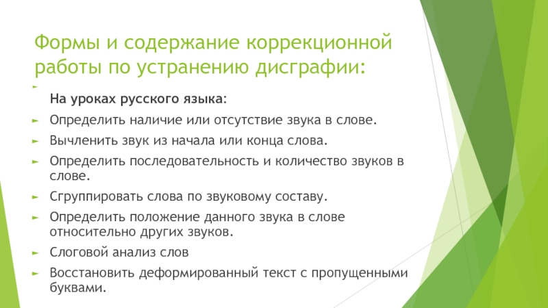 Слайд 8Формы и содержание коррекционной работы по устранению дисграфии: