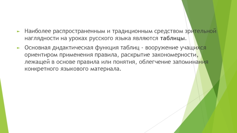 Основная дидактическая функция таблиц - вооружение учащихся ориентиром применения правила, раскрытие закономерности, лежащей в основе правила или понятия, облегчение запоминания конкретного языкового материала.