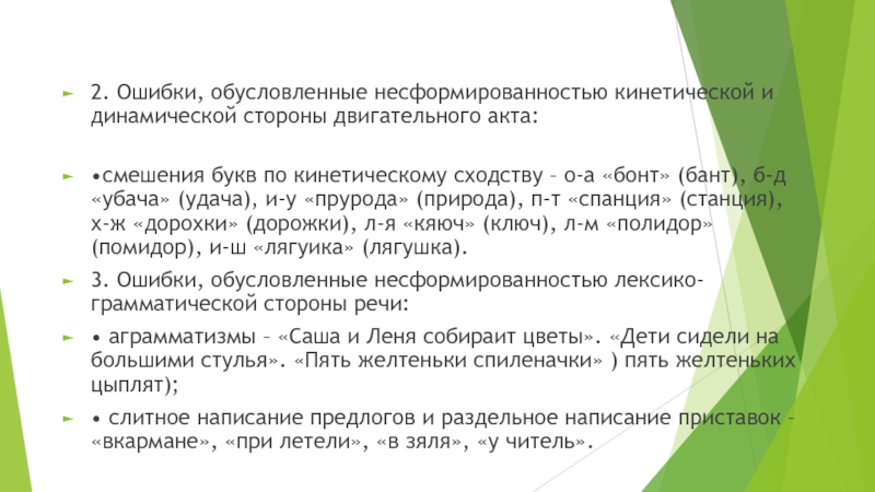 Слайд 52. Ошибки, обусловленные несформированностью кинетической и динамической стороны двигательного акта: