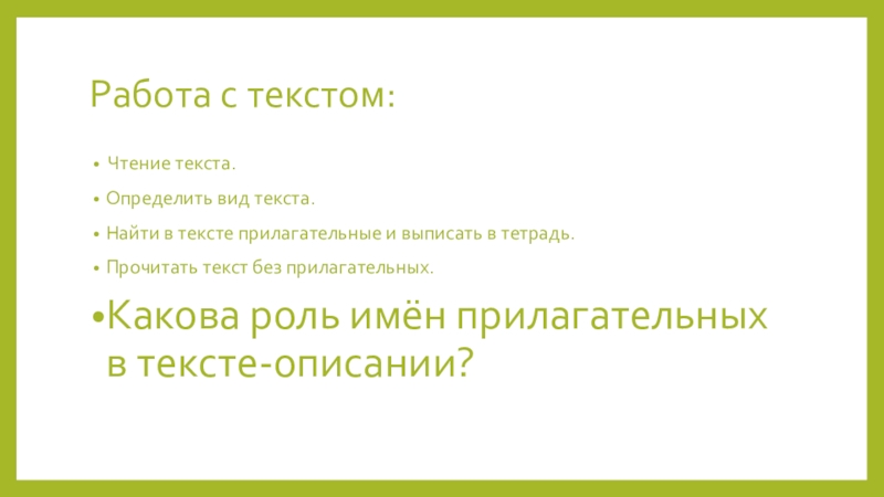 Работа с текстом: Чтение текста.Определить вид текста.Найти в тексте прилагательные и выписать в тетрадь.Прочитать текст без прилагательных.Какова