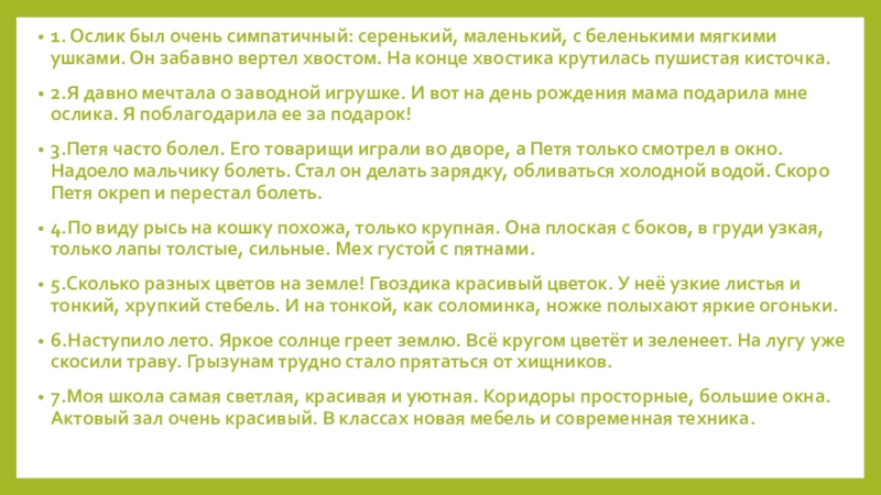 1. Ослик был очень симпатичный: серенький, маленький, с беленькими мягкими ушками. Он забавно вертел хвостом. На конце