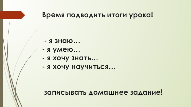 Слайд 9Время подводить итоги урока! - я знаю… - я умею… - я хочу