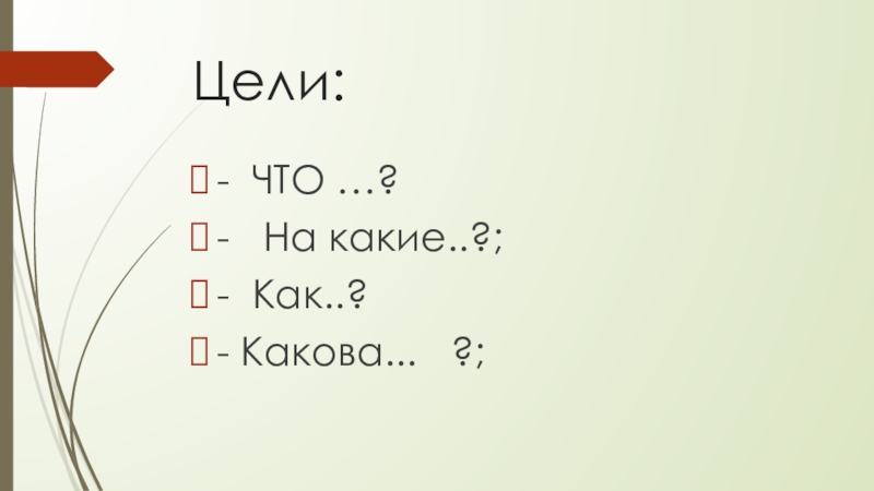Цели:- ЧТО …?-  На какие..?;- Как..?- Какова...  ?;