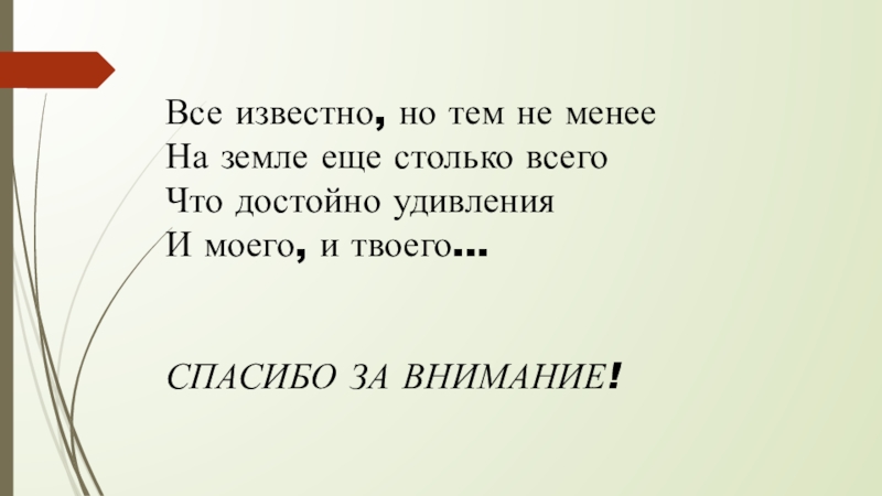 Все известно, но тем не менееНа земле еще столько всегоЧто достойно удивленияИ моего, и твоего…СПАСИБО ЗА ВНИМАНИЕ!