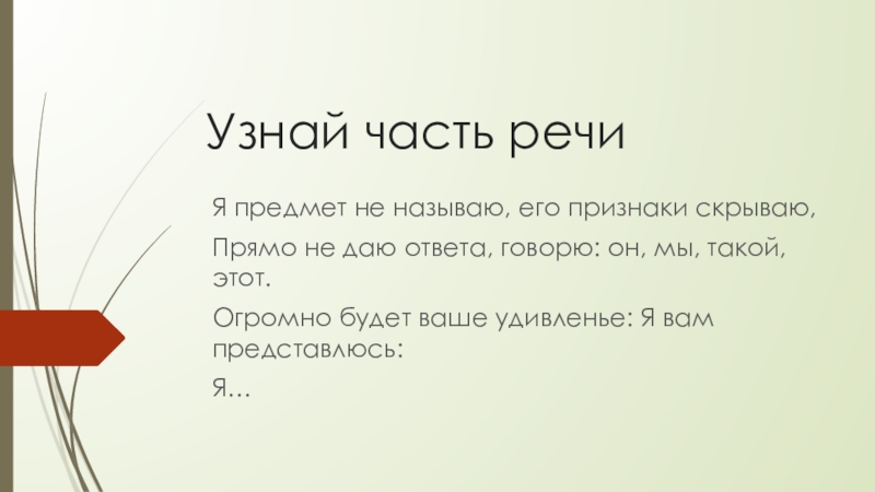 Узнай часть речиЯ предмет не называю, его признаки скрываю,Прямо не даю ответа, говорю: он, мы, такой, этот.Огромно будет ваше удивленье: Я вам представлюсь:Я…