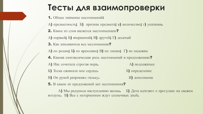 Тесты для взаимопроверки1. Общее значение местоимений:А) предметность; Б) признак предмета; в) количество; г) указания.2. Какое из слов