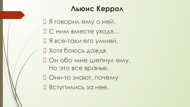 Льюис Керрол Я говорил ему о ней,С ним вместе уходя…Я все-таки его умней,Хотя боюсь дождя.Он обо мне