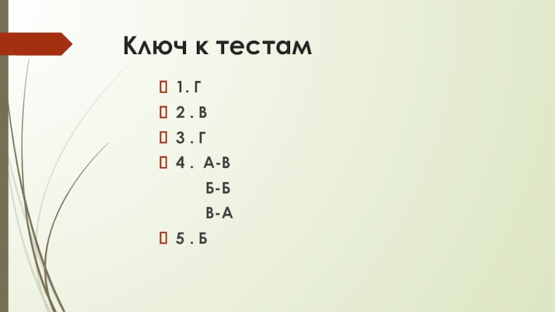 Ключ к тестам1. Г2 . В3 . Г4 . А-В     Б-Б