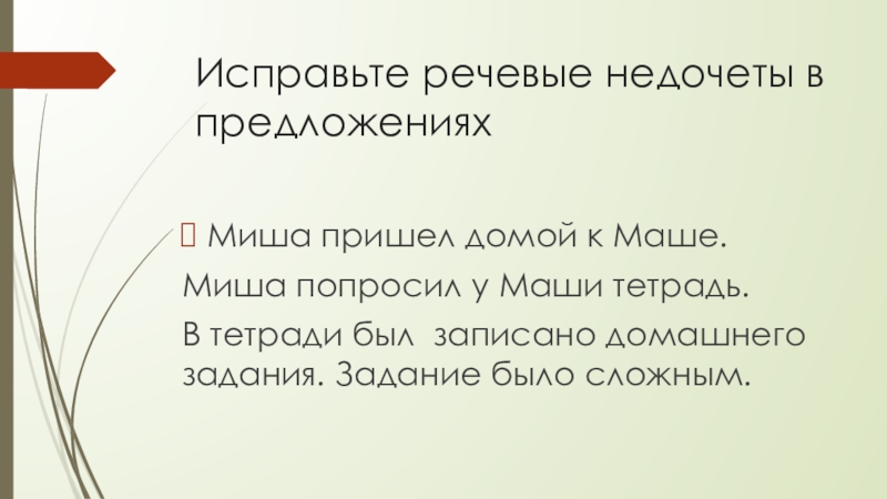 Исправьте речевые недочеты в предложенияхМиша пришел домой к Маше.Миша попросил у Маши тетрадь.В тетради был записано домашнего