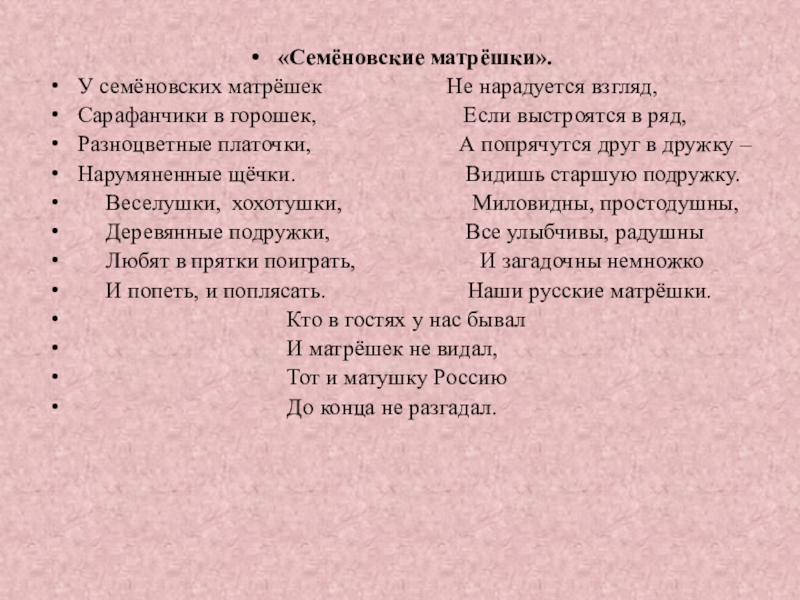 «Семёновские матрёшки».У семёновских матрёшек	           Не нарадуется взгляд,Сарафанчики