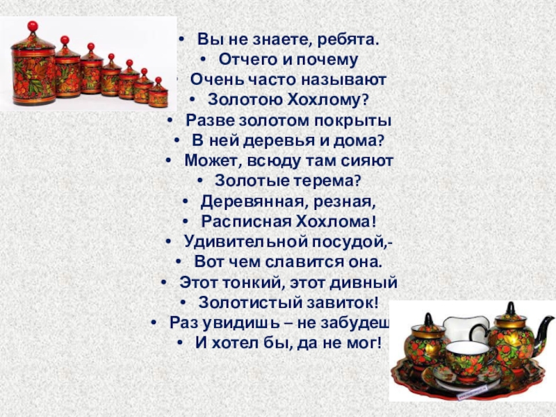 Вы не знаете, ребята. Отчего и почемуОчень часто называютЗолотою Хохлому?Разве золотом покрытыВ ней деревья и дома?Может, всюду