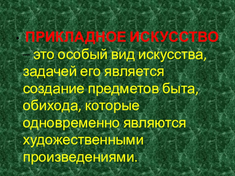 ПРИКЛАДНОЕ ИСКУССТВО – это особый вид искусства, задачей его является создание предметов быта, обихода, которые одновременно являются художественными произведениями.