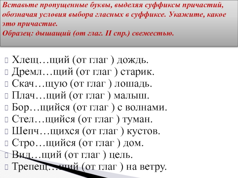 Вставьте пропущенные буквы, выделяя суффиксы причастий, обозначая условия выбора гласных в суффиксе. Укажите, какое это причастие.