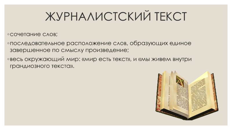ЖУРНАЛИСТСКИЙ ТЕКСТсочетание слов;последовательное расположение слов, образующих единое завершенное по смыслу произведение;весь окружающий мир: «мир есть текст», и