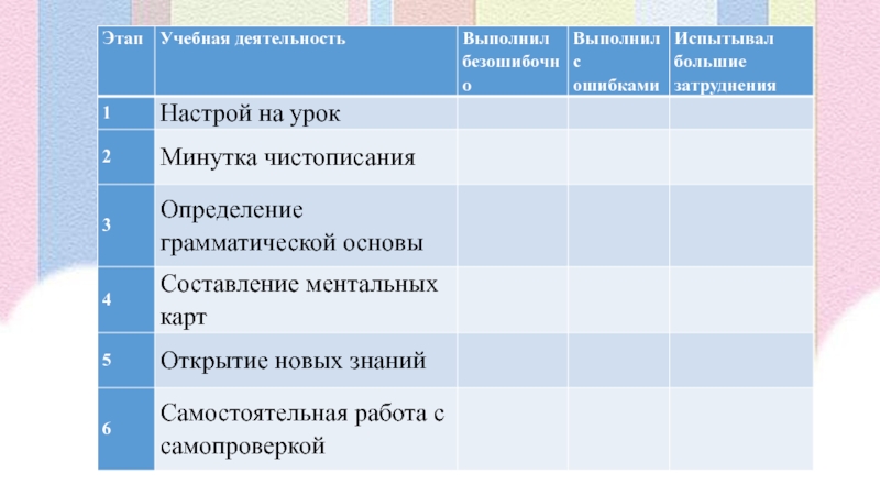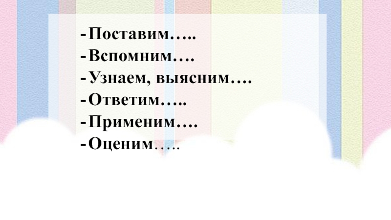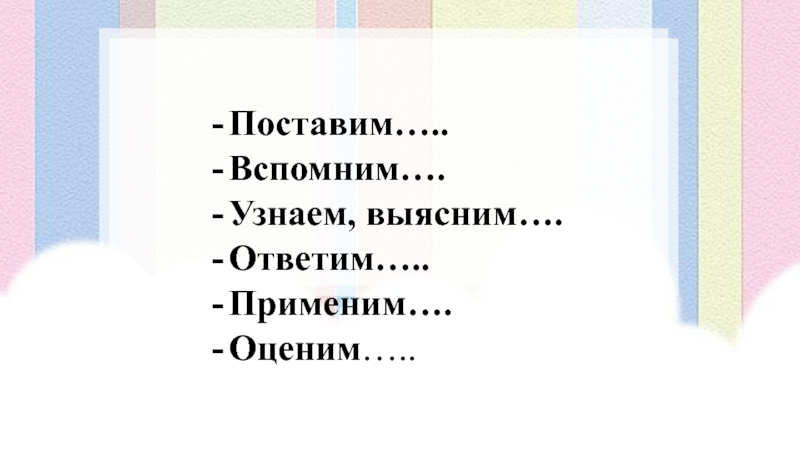 Поставим…..Вспомним….Узнаем, выясним….Ответим…..Применим….Оценим…..