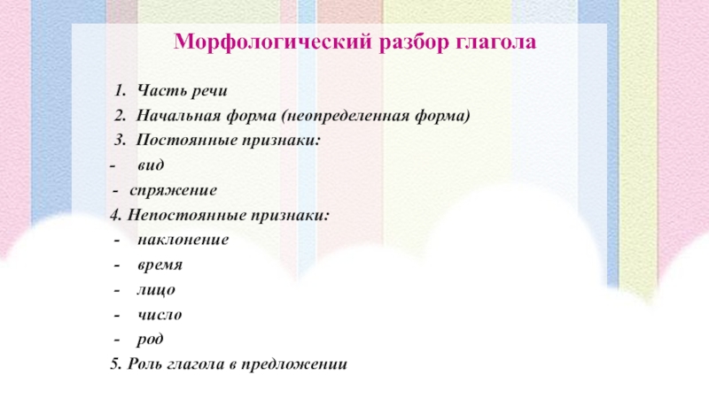 Морфологический разбор глагола    1. Часть речи    2. Начальная форма (неопределенная форма)