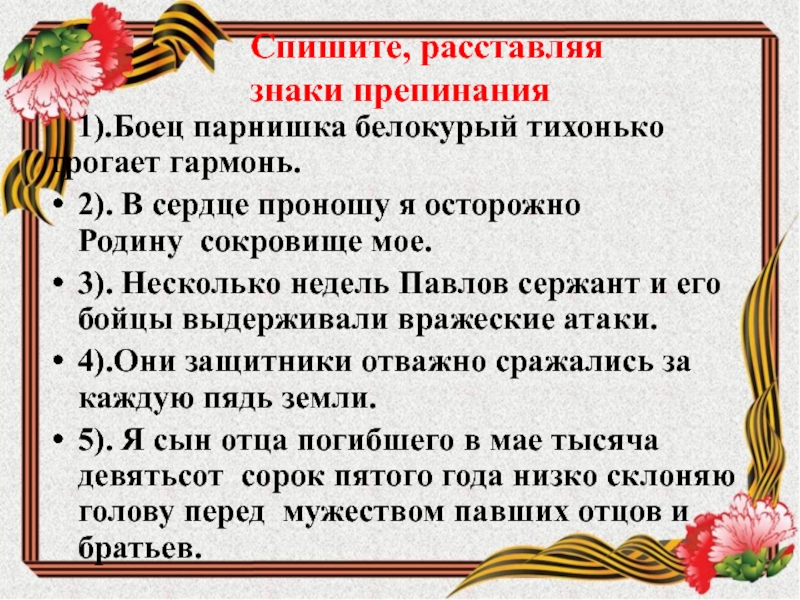 5). Я сын отца погибшего в мае тысяча девятьсот сорок пятого года низко склоняю голову перед мужеством павших отцов и братьев.