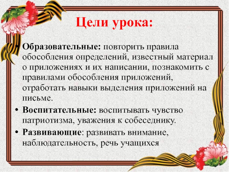 Образовательные: повторить правила обособления определений, известный материал о приложениях и