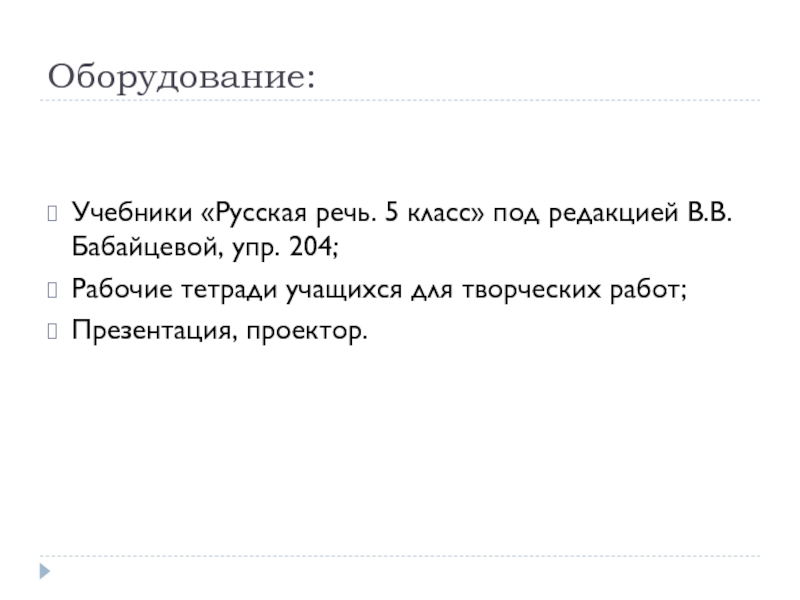 Оборудование:Учебники «Русская речь. 5 класс» под редакцией В.В. Бабайцевой, упр. 204;Рабочие тетради учащихся для творческих работ;Презентация, проектор.