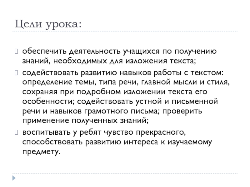 Цели урока:обеспечить деятельность учащихся по получению знаний, необходимых для изложения текста;содействовать развитию навыков работы с текстом: определение темы, типа речи, главной мысли и стиля, сохраняя при подробном изложении текста его особенности; содействовать устной и письменной речи