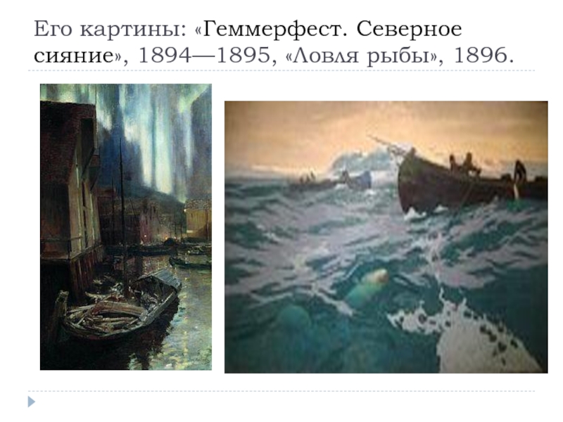 Слайд 5Его картины: «Геммерфест. Северное сияние», 1894—1895, «Ловля рыбы», 1896.