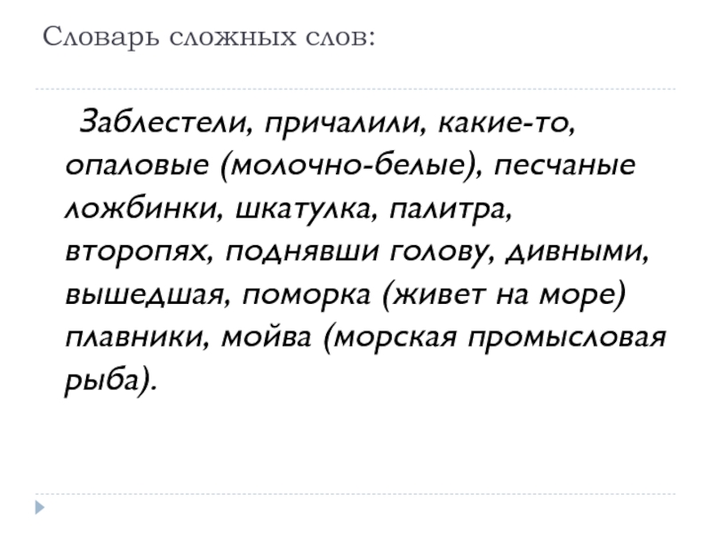 Словарь сложных слов:    Заблестели, причалили, какие-то, опаловые (молочно-белые), песчаные ложбинки, шкатулка, палитра, второпях, поднявши
