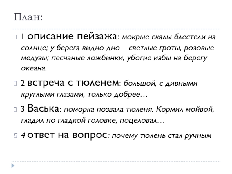 План:1 описание пейзажа: мокрые скалы блестели на солнце; у берега видно дно – светлые гроты, розовые медузы;