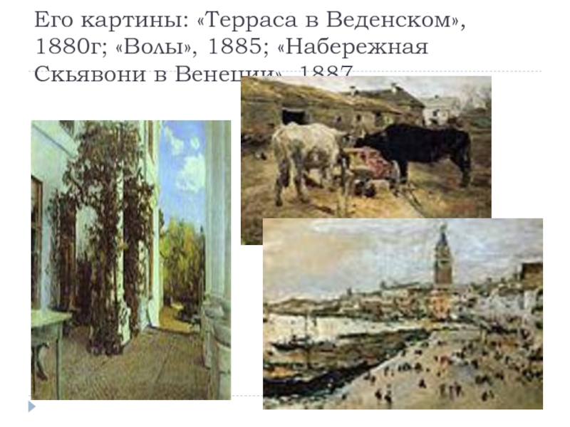 Слайд 7Его картины: «Терраса в Веденском», 1880г; «Волы», 1885; «Набережная Скьявони в