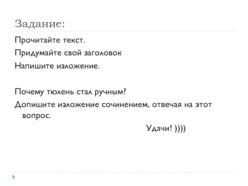Задание:Прочитайте текст.Придумайте свой заголовокНапишите изложение.Почему тюлень стал ручным?Допишите изложение сочинением, отвечая на этот вопрос.