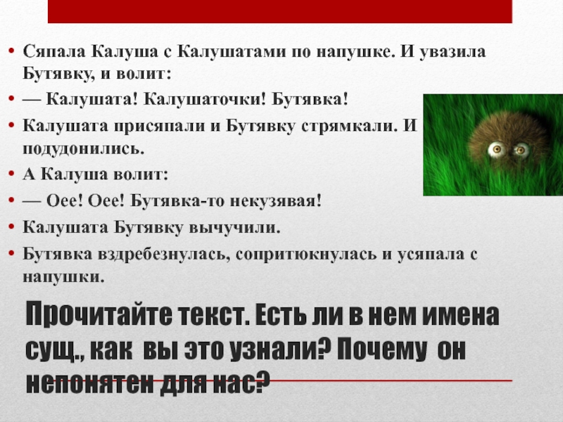 Сяпала Калуша с Калушатами по напушке. И увазила Бутявку, и волит: