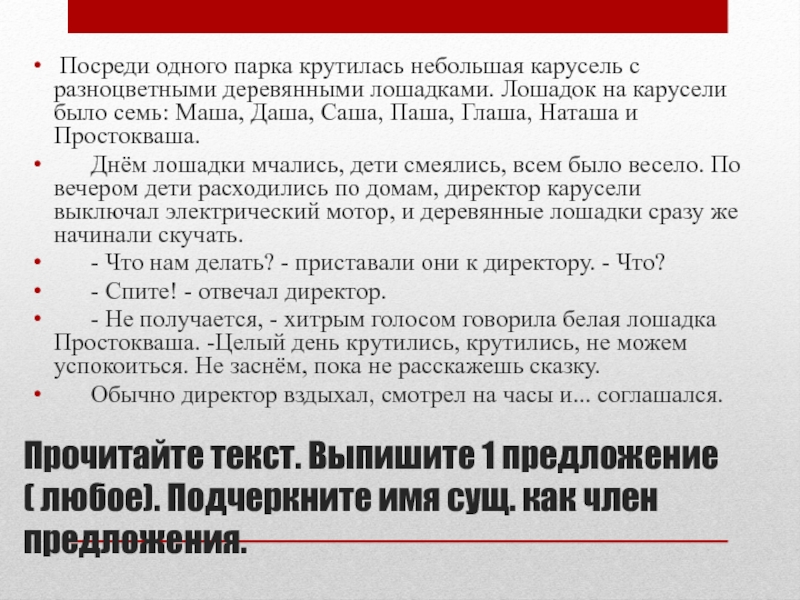 Посреди одного парка крутилась небольшая карусель с разноцветными деревянными лошадками. Лошадок на карусели было семь: Маша, Даша, Саша, Паша, Глаша, Hаташа и Простокваша.